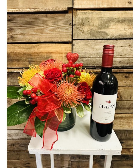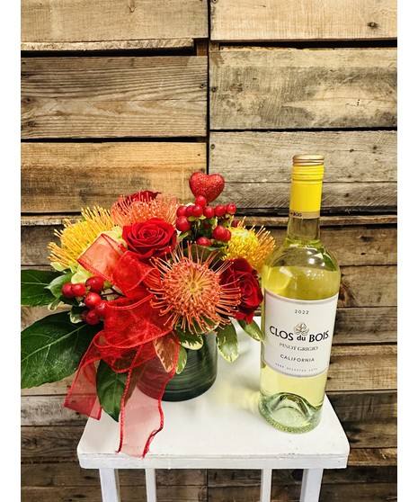 Gorgeous tropical flowers such a pincushion protea, (assorted colors) and red hypericum berries, lush red roses and green hydrangeas designed in a low compact design in a clear glass cylinder vase. Accented with a red sheer ribbon and holiday heart.