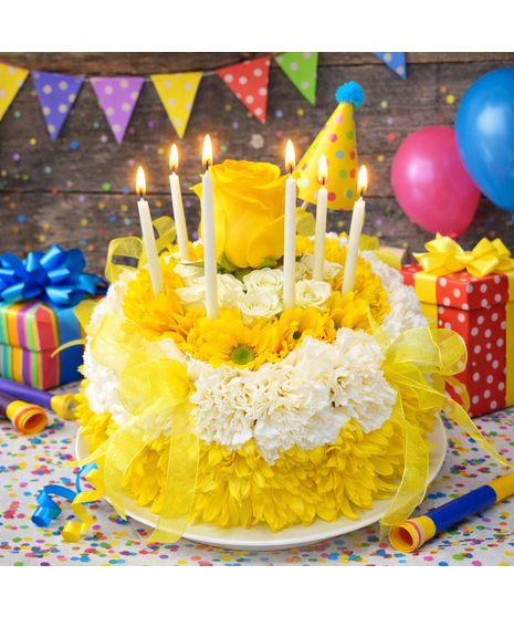 Tell the birthday guy or gal to make a wish on these candles! Made entirely of fresh flowers, this delightful "cake" will really make their day special. The recipe for this cake includes a carnations, mums and accented with a rose and candles. It's everything they could wish for!