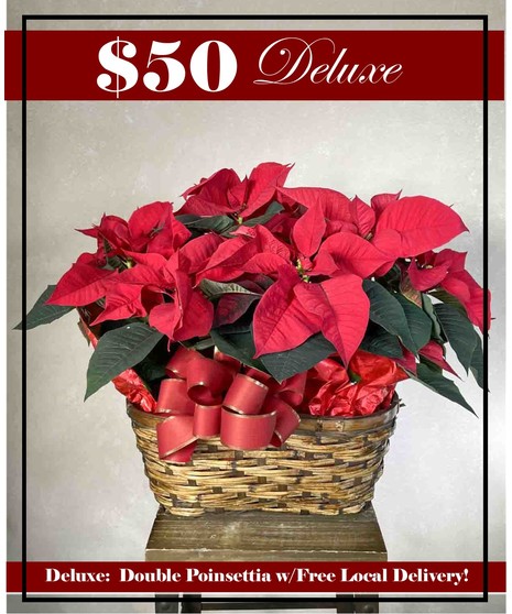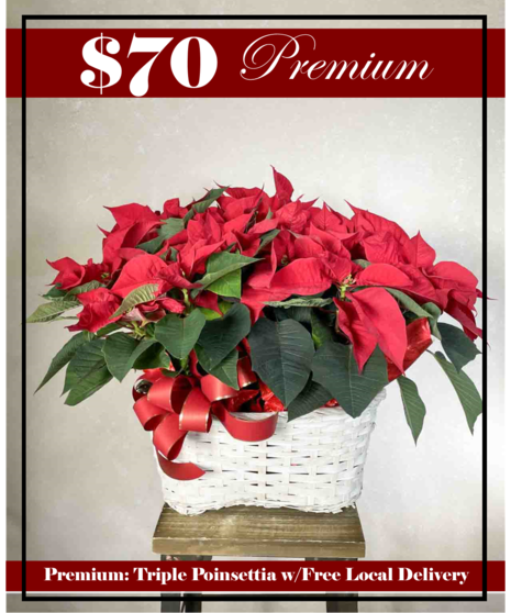 Upgrade to Deluxe for $50 for a Double Poinsettia basket with bow or bump up to a Premium version for $70 for a Triple Poinsettia basket with bow.