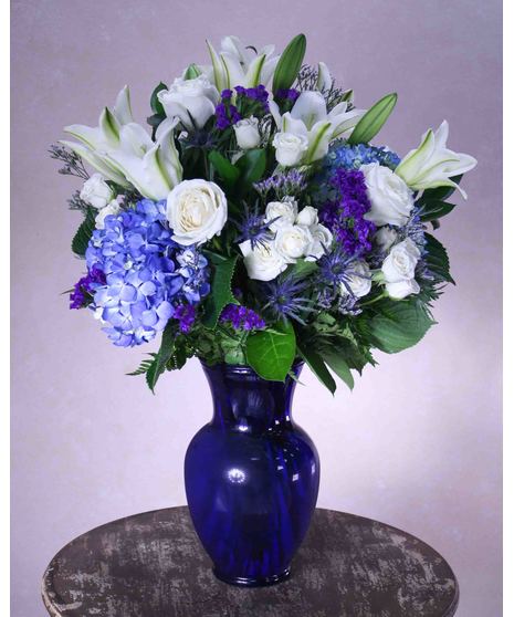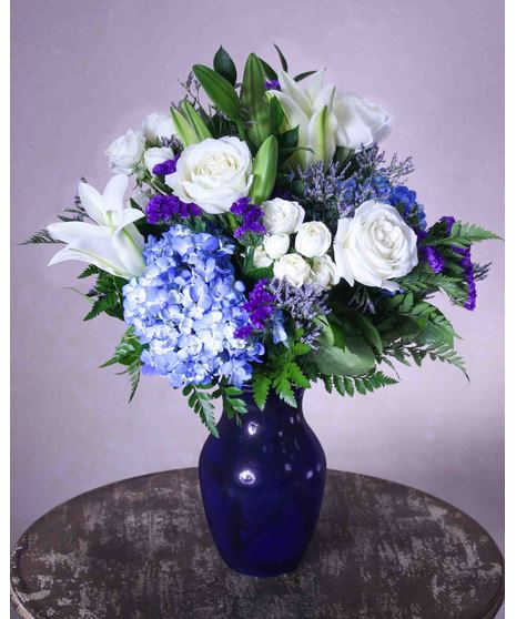 Our stunning and simply, Beautiful In Blue arrangement is designed with: Blue Hydrangea, White Lilies, White Roses, White Spray roses, Caspia, Statice and Assorted Greens, inside of a Blue Vase. Upgrade to our (DELUXE) or (PREMIUM) version to enhance the arrangement with more White Lilies, White Roses and added Blue Thistle! A perfect gift for many occasions!