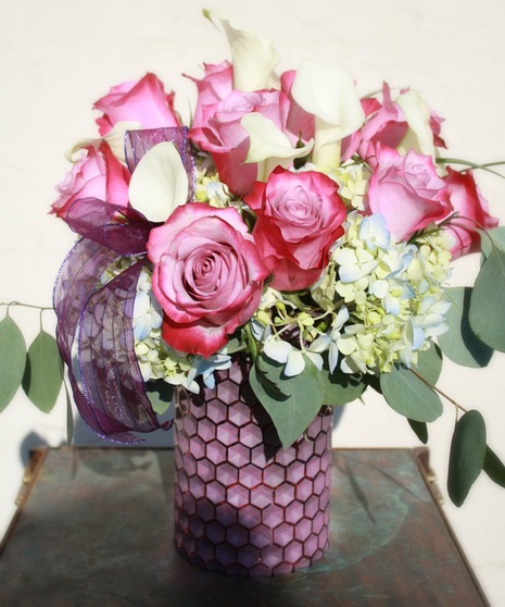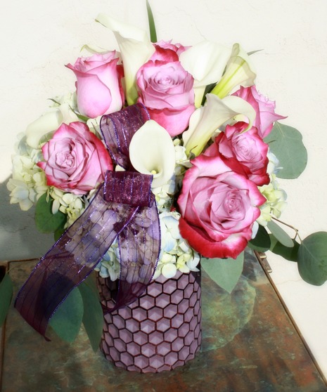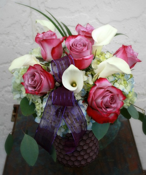 Luscious avante garde lavender roses and crisp white calla lilies nestled in a bed of blue hydrangea. Accented with silver dollar eucalyptus and lily grass in a modern plum colored honeycomb vase.