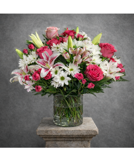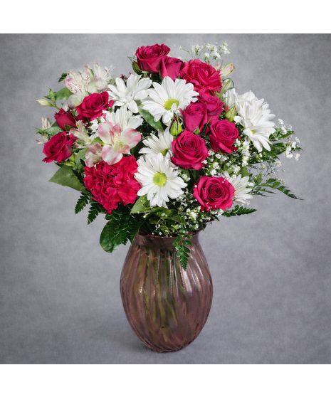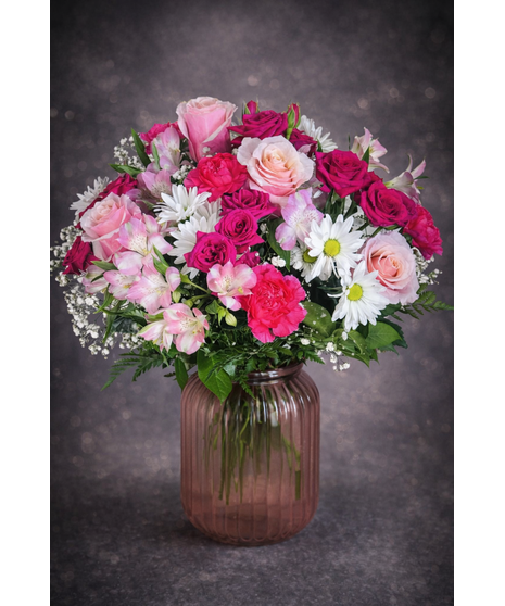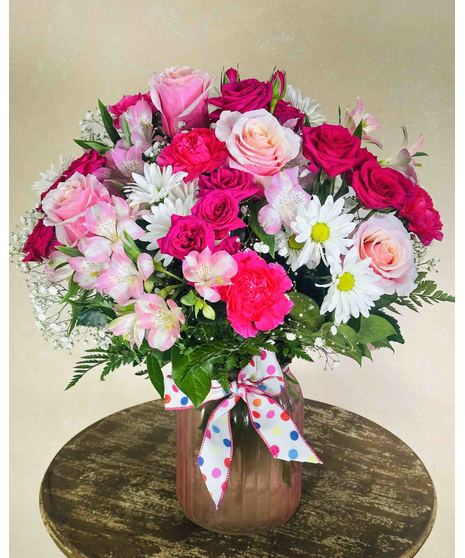 Polka Dots & Posies from Port Charlotte Florist is a joyful expression of cheer and charm, artfully arranged to brighten anyone’s day. Bursting with sweet pink spray roses, playful white daisies, and lush greenery, this darling bouquet captures the essence of happiness in bloom. Nestled in a clear glass cube vase adorned with a whimsical pink-and-white polka dot ribbon, this arrangement is as delightful as it is stylish, bringing together the beauty of classic blooms with a fresh, modern twist.