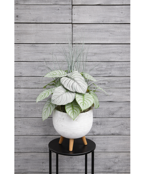 Upgrade to a Calathea in a White ceramic footed container with additional grasses to your decor in our Deluxe version, LPC280B