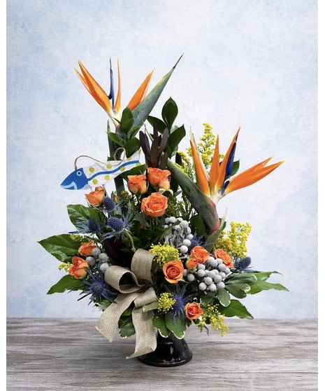 Tall, dramatic Birds of Paradise stretch skyward with their fiery orange and blue plumage, while rich Safari Sunset and vibrant orange roses bring warmth and depth. Touches of silver brunia and blue thistle add a cool contrast and whimsical, woodland flair. Airy solidago sprigs soften the arrangement and add a pop of sunshine. And right in the middle of it all? A charming striped wooden fish pick that makes this design truly one-of-a-kind.