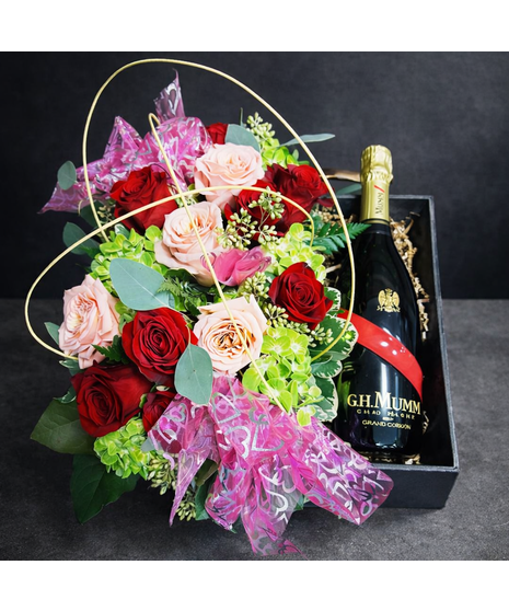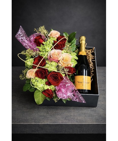 Your wish has come true—we have a bundle of roses and champagne just for you! Enjoy a dozen red and peach roses accented with eucalyptus and green hydrangea in a modern low design. We offer prosecco and champagne options to fit your personal taste.