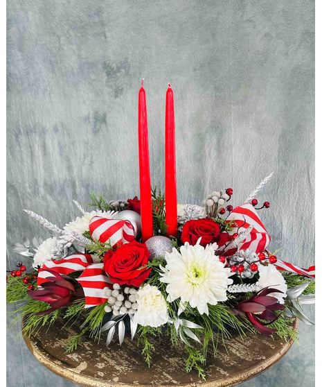 At the heart of the design, two bold red taper candles rise above the arrangement, ready to cast a soft, glowing light over any holiday table. Candy cane–striped ribbons weave throughout the design, tying everything together with a classic holiday flair that’s both cheerful and sophisticated.