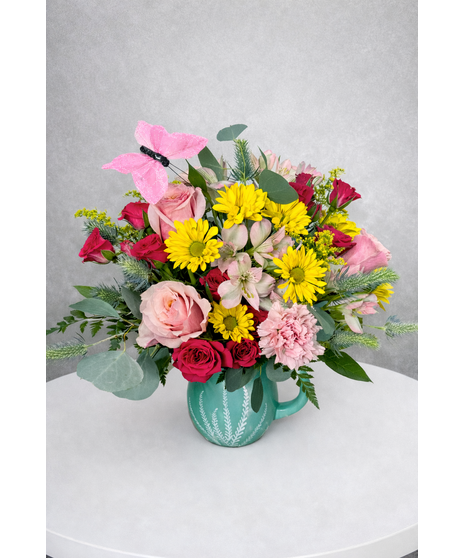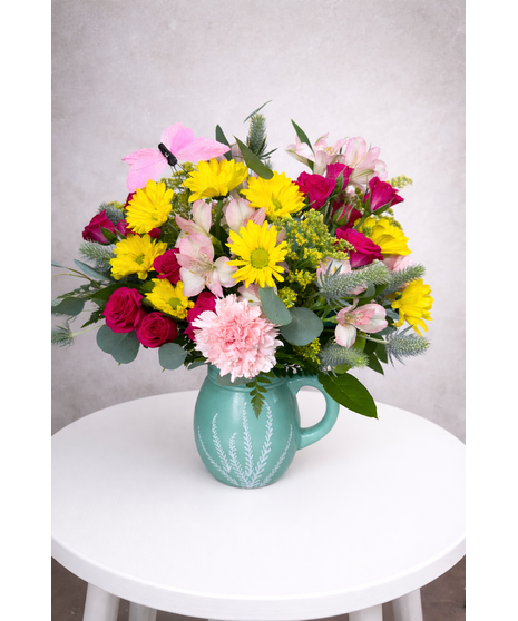 Vibrant yellow daisies, blush alstromeria, soft pink carnations and hot pink spray roses create the Colorful Pitcher. Accented with blue thistle, a glittery butterfly, and a springtime bow to match the keepsake aqua pitcher, this design features a two-for-one with fresh flowers and a keepsake item.