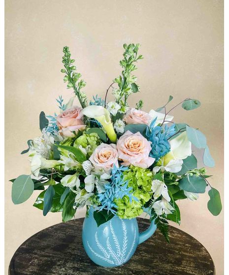 Soak up the sunshine with this charming Coral Charm bouquet. Peach Roses, green hydrangeas, white calla lilies and white alstromeria and larkspur are delightfully arranged in a keepsake ceramic printed pitcher. Accented with silver dollar eucalyptus, and dried caspia make this the perfect birthday, anniversary, welcome to your new home, or any other occasion gift. **