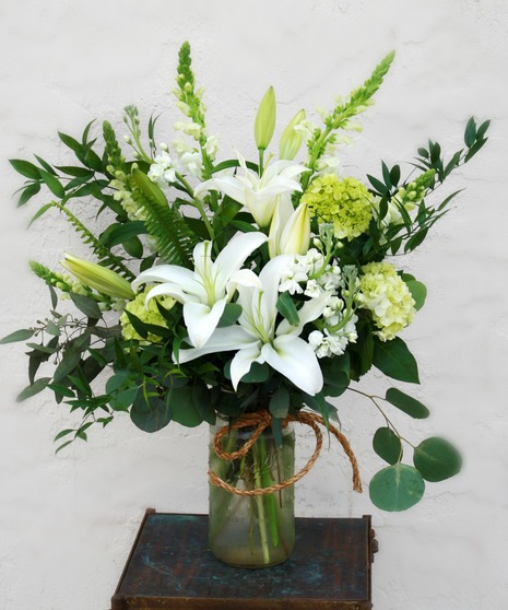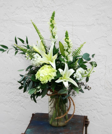 Fresh off the flower farm this delightful arrangement boosts crisp white lilies, snapdragons, and stock. With a touch of green hydrangea this half gallon mason jar arrangement is sure to please. Available for local delivery to North Port, Port Charlotte & Punta Gorda, Florida.