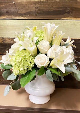 Remember sweet memories of passed family or friends with this crisp white flower arrangement. White lilies, white and light green hydrangea, and white roses highlight this sympathetic piece.