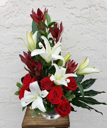 Ignite hearts and stir deep emotions with the striking Explosion of Love arrangement from Port Charlotte Florist. This passionate design bursts with romance, showcasing velvety red carnations and lush white lilies—each bloom selected for its beauty and long-lasting charm. The dynamic contrast of snowy white petals and bold crimson tones creates a dramatic, elegant statement that’s ideal for anniversaries, romantic milestones, or simply saying “I love you” in unforgettable style. In our deluxe and premium versions, we've added radiant red roses to heighten the visual impact and elevate this already breathtaking piece. The roses' soft, timeless petals bring classic romance, while the lilies’ graceful shape adds a fresh, uplifting fragrance and vertical movement. All of this is carefully hand-arranged with complementary foliage to provide texture and fullness.
