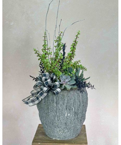 Over sized succulent garden brimming with echeveria's. Cactus and succulent plants are uniquely arranged in this distinguished concrete container. Garden lovers rejoice!