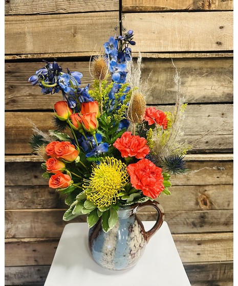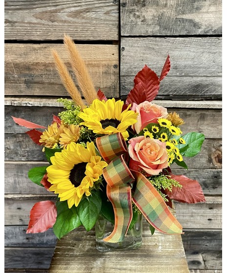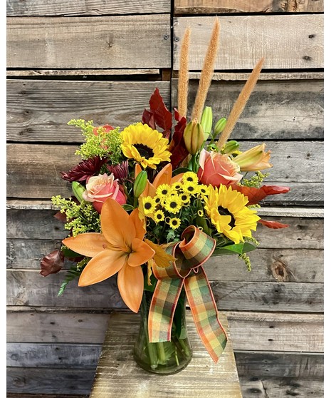 Celebrate the golden glow of the season with our Burst of Autumn bouquet from Port Charlotte Florist. This radiant floral arrangement is a joyful expression of fall’s vibrant beauty, brimming with warm, sunny blooms in shades of orange, yellow, and amber. A festive mix of roses, sunflowers, and cheerful chrysanthemums is lovingly gathered together and accented with delicate oak leaves that capture the essence of autumn’s natural charm. Nestled in a classic clear glass vase and accented with fall plaid ribbon, this arrangement is as uplifting as it is eye-catching. Whether you’re sending it for a fall birthday, Thanksgiving gathering, or just to bring a little seasonal joy into someone’s home, Burst of Autumn is a delightful choice. Upgrade to the Deluxe version to include orange lilies and additional flowers.