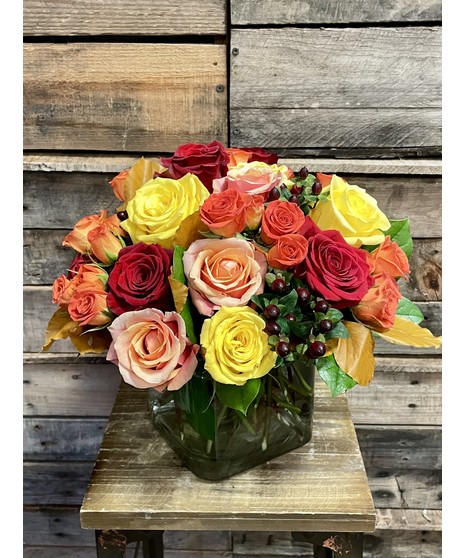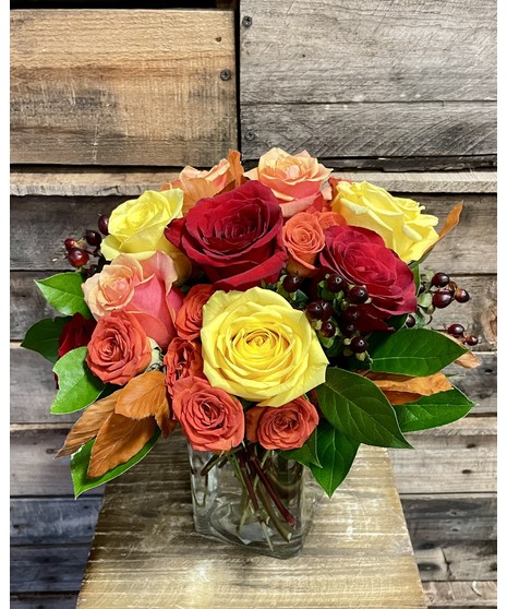 The Fall Colored Roses arrangement is a warm and inviting floral display that captures the essence of autumn's vibrant palette. This beautiful arrangement features exquisitely selected orange, red and yellow roses each bloom carefully chosen for its rich color and fullness. The roses are arranged in clear glass cubes, a modern and stylish vase that enhances the visual appeal of the bouquet and accented with fall leaves and hypericum berries.