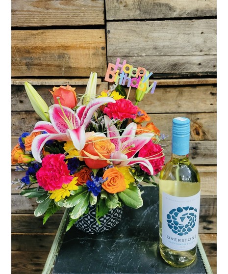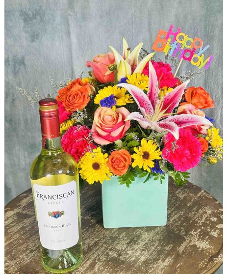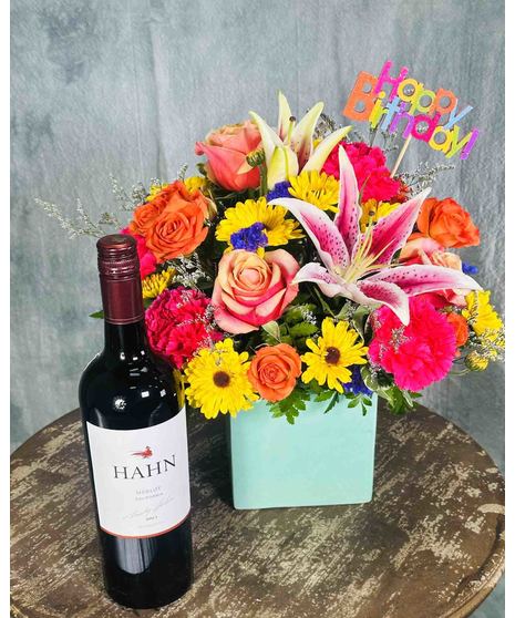 Pure Happiness is what this vibrantly, gorgeous bouquet delivers! Our Birthday Block Arrangement is passionately designed with: Orange Roses, Orange Spray Roses, Hot Pink Carnations, Statice, Caspia, Assorted Greens, and a "Happy Birthday" Pick, in a cute, Ceramic colored Block Vase. Upgrade today with our (DELUXE) variation that includes a bottle of (RED) or (WHITE) Wine of your choice! Surely, no one can be in the presence of something SoOoOo inherently Happy and not Smile =)