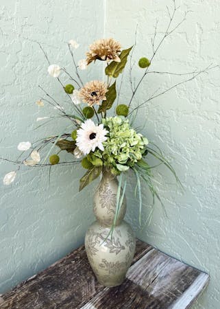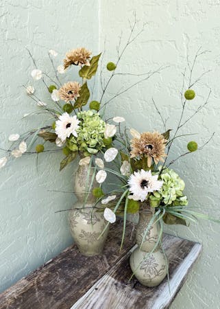 White and tan gerbers are accented with green hydrangeas and pods. Standing tall in these muted green vases accented with a floral design. Small design measures 13" wide by 16" deep and 34" high. Large design measures 19" wide by 11" deep and 44" high.