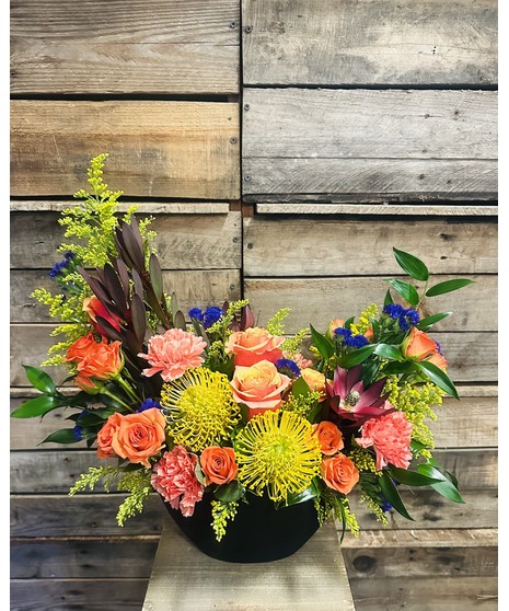 At the heart of this design are golden pincushion protea, their exotic shape echoing the sun’s fiery glow as it dips below the horizon. Safari sunset foliage adds dramatic depth, while vivid orange roses and cherry brandy roses blend fiery amber and peach tones for a sun-kissed effect. Cheerful orange carnations and golden solidago complete the look with fullness and whimsy, all accented with fresh greenery to add movement and lush contrast.