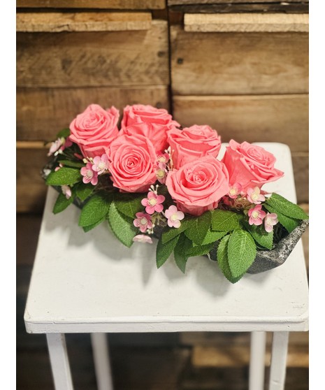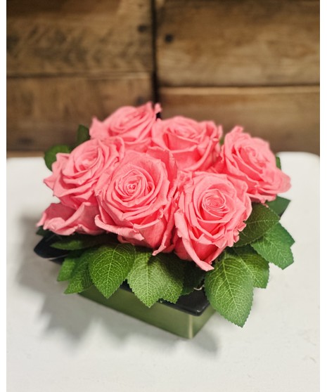 Send this stunning arrangement of Preserved Roses designed in a low concrete urban style container. Perfect touch for any coffee table, desk, entry table etc. Available in many colors and styles. Includes 12 or 6 roses in selected styles.