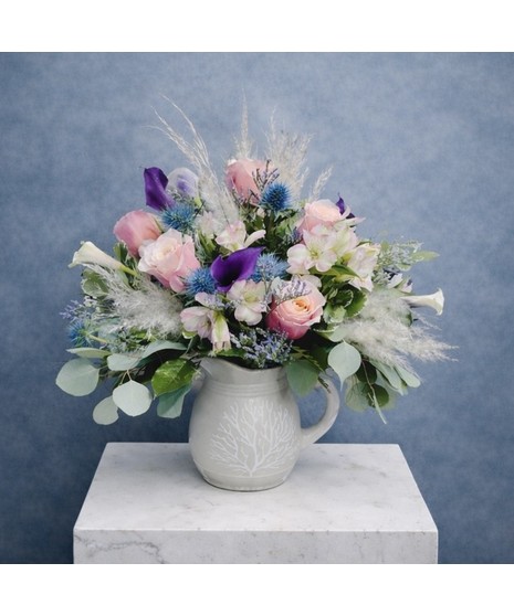 Hint of European flare with our French Cafe Bouquet, perfect collection of pink hydrangeas, purple mini calla lilies, pink alstromeria, flamingo roses accented with caspia and thistle all designed in a keepsake gray ceramic pitcher. Added in for the extra touch is silver dollar eucalyptus.