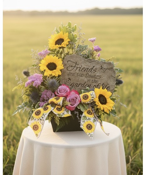 Celebrate the beauty of friendship with the Friends Are Flowers Arrangement from Port Charlotte Florist. This stunning gift is more than just a bouquet—it’s a heartfelt reminder of how precious friends truly are. At its center rests a keepsake garden stone etched with the touching message, “Friends are the flowers in the garden of life.” This meaningful sentiment makes it a perfect keepsake for years to come, whether displayed in a garden, on a lanai, or inside the home. Surrounding the stone is a vibrant mix of blooms that perfectly captures the warmth and joy of friendship. Cheerful sunflowers radiate happiness, while elegant purple roses add a soft, romantic touch. Dried lavender flowers and blue thistle bring texture and depth, creating a design that feels both rustic and refined. A sunflower ribbon ties the arrangement together, adding charm and brightness.