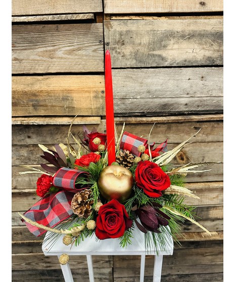 Classic holiday centerpiece with just the right amount of holiday trim. Stunning red roses, red carnations, red safari sunset, gold grevalia, gold berries, and a golden apple all nestled in a traditional design, includes a single red taper candle. Deluxe version includes same collection of flowers just more of them. Perfect for holiday gift giving as well.
