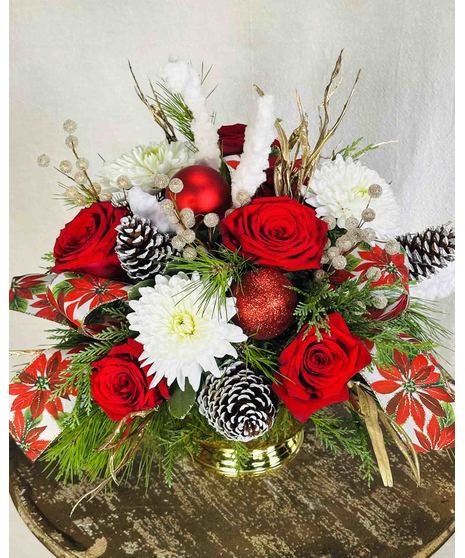 Embrace the joy of the season with this red, white and gold centerpiece. Holiday greens are crafted with gold berries, red ornaments, and red poinsettia ribbon with red carnations and white mums in a low gold bowl.
