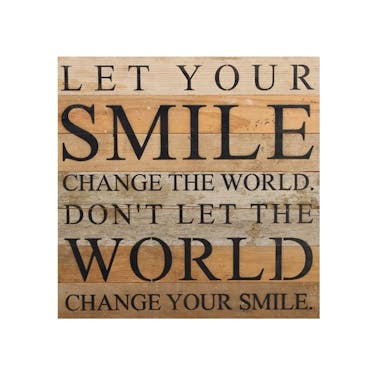 This natural wood sign with assorted background color tones, features the saying 'Let your smile change the world. Don't let the world change your smile" on the front with a bold font. Approximately 14" wide x 14" high and Made in the USA.
