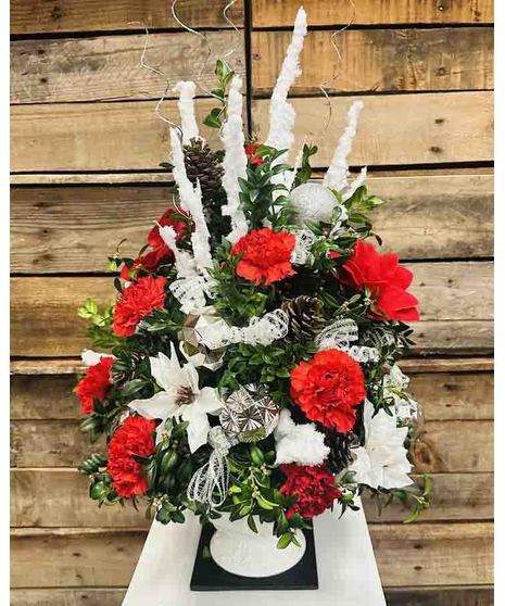 Add a touch of timeless holiday magic to any home with our Lighted Boxwood Tree from Port Charlotte Florist. Expertly handcrafted from lush, fresh boxwood greenery and shaped into the form of a classic Christmas tree, this festive creation is a celebration of seasonal charm and creativity. Adorned with brilliant red carnations, white flower blooms, pinecones, sparkling ornaments, and whimsical curly accents, every detail of this design has been thoughtfully chosen to dazzle and delight. Nestled in an elegant pedestal container, this piece has built-in lights that bring a warm, cozy glow, perfect for tabletops, entryways, or desks where a full-sized tree won’t fit. Whether you're sending holiday cheer to a loved one or elevating your décor, this long-lasting boxwood tree is a joyful alternative to traditional arrangements.