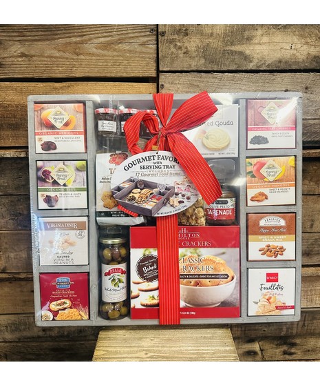 Our Gourmet Favorites with Serving Tray is an excellent, delicious, gourmet gift, perfect for any occasion! This premium gourmet collection is the best of both worlds, with mouth savory assorted gourmet foods, paired perfectly together with a lovely keepsake serving board for further use.