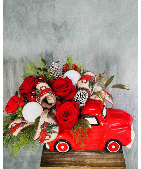 Merry is on the way with this holiday flower arrangement designed in a keepsake red ceramic truck with rich red roses, red carnations, nestled with pine cones, ornaments, and a special delivery red truck ribbon! Upgrade to the deluxe version and receive all red roses.