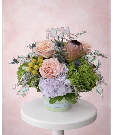 Celebrate her with the soft beauty of our Mom’s Garden Arrangement, a lush, garden-inspired floral design filled with premium seasonal blooms. This elegant arrangement features delicate blush roses, vibrant green hydrangea, soft lavender hydrangea, and unique textural accents like protea and thistle. Accented with cheerful yellow billy balls and finished with a charming “Mom” keepsake pick, this design brings a fresh, modern twist to a classic garden style.
