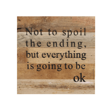 This natural wood sign with assorted background color tones, features the saying 'Not to spoil the ending, but everything is going to be ok' on the front with a bold font. Approximately 10" wide x 10" high and Made in the USA.