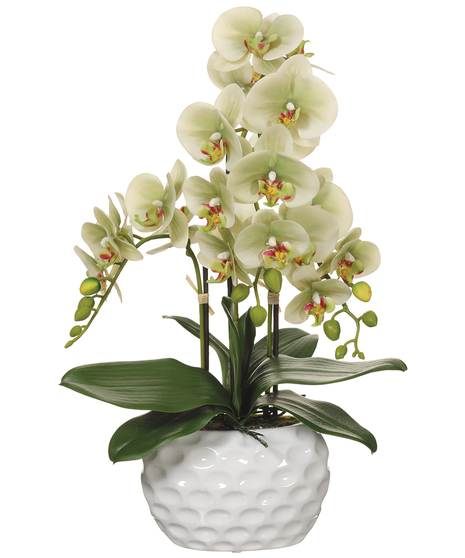 Full of realistic detail, this silk Phalaenopsis plant is loaded with orchid blooms and real-touch leaves. It is designed in a geometric oval ceramic pot and stands approximately 22" tall.