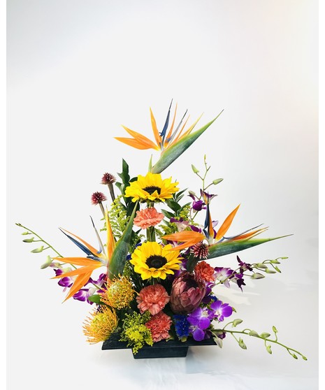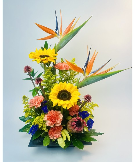 Send some Florida sunshine with our "Sundazed" Arrangement. Vibrant birds of paradise, sunny sunflowers, orange carnations, purple statice, solidago, and the unique tropical Stella blooms are sure to make anyone smile for all occasions. This unique Port Charlotte Florist design is one of our favorites.