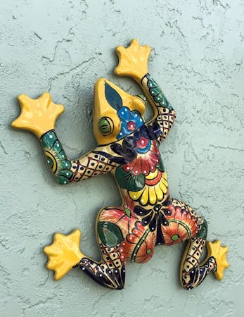 Talavera is hand crafted traditional Mexican Pottery designed in bright colors and detailed patterns. Know for their exceptional quality and source only from certified Talavera workshops. Brought to you by Port Charlotte Florist. Jazz up you lanai with a vibrant wall frog! Approximately 22" x 16" x 4". Colors are assorted, primary color backgrounds may be: red, rust, navy, green, yellow, or orange.