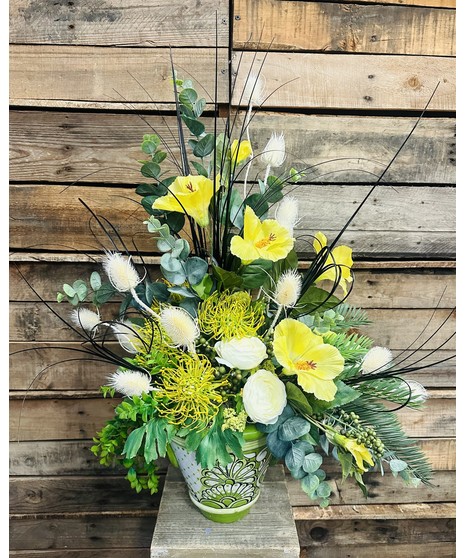 Unique Talavera Silk Wall Pocket designs are one of a kind pieces designed exclusively at Port Charlotte Florist. The colorful design features red antherium, a vibrant orange Monarch butterfly, an array of gold and blue accent flowers and an assortment of greenery. Measuring approximately 34" high by 25" wide. The green and white design features yellow protea, bleached thistle, creamy ranunculus and yellow hibiscus flowers. Accented with a variety of greens and grasses. Measuring approximately 31" high by 30" wide.