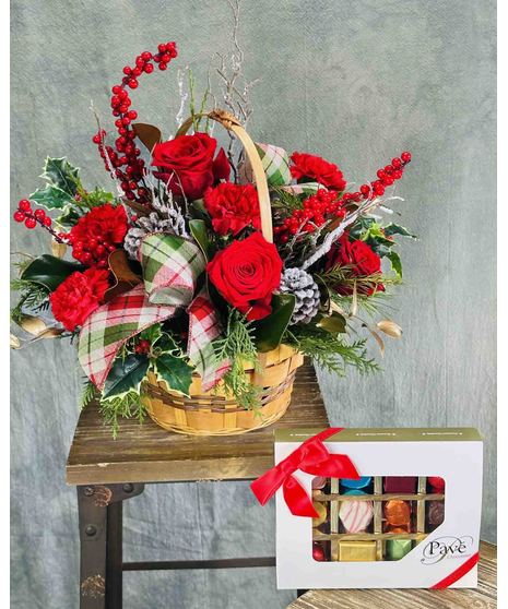 Handcrafted with fresh red roses, carnations, and seasonal greens, and accented with pinecones, holly, and red berry stems. Finished with a festive tartan plaid ribbon in a rustic woven basket. Ideal for Christmas tables, holiday parties, or winter gifting.