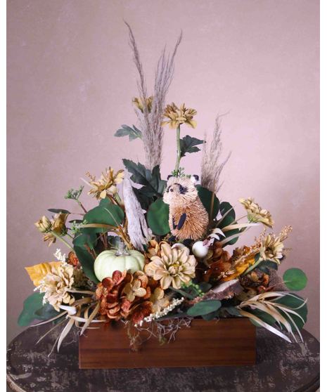 Share your special Thoughts of Autumn (SILK) with this gorgeous and vibrant arrangement that perfectly embodies the Fall Season! Creamy, beige and taupe tone flowers are accented with dried flowers and assorted greens and a cute little woodsy raccoon.