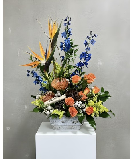 Tropical Colors features stunning birds of paradise, orange pincushion protea, blue delphinium, orange spray roses, and fillers such as silver brunia berries and salidago. Tropical Colors is an exquisite arrangement that brings the vibrant essence of the tropics into any setting.