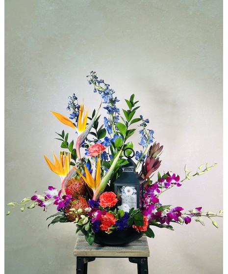 Illuminate their heart with this one of a kind floral and sympathy gift combo. A beatiful tropical design surrounds this keepsake distressed white lantern with a sentimental saying. Blue delphinium, birds of paradise, orchids, roses and more make a beautiful background for the battery operated lantern.