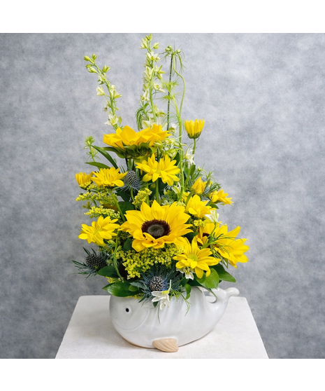 With summer around the corner and the ocean vibes setting in, what better way to show your love and appreciation than by sending someone our beautiful White Whale Floral Arrangement! This absolutely adorable arrangement is designed with: Larkspur, Sunflowers, Yellow Daisies, Thistle and Golden Aster, in a gorgeous White Ceramic Whale Planter! Upgrade this beautiful arrangement today to our (DELUXE) version which includes: (2) added Mylar Balloons!