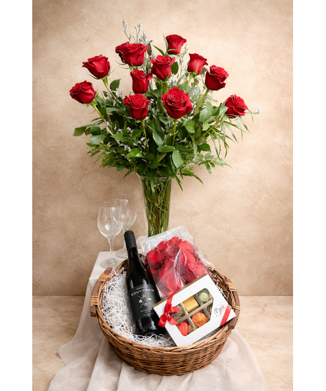 Spend a romantic evening with the one you love and have roses, chocolates, wine & glasses, and red rose petals delivered! Available in 12 or 24 long stem roses, accented with filler and assorted greenery, wine & glasses, Pave Chocolates (depending on size selected determines size of box) and soft red petals in a keepsake container. Standard is packaged in a wicker basket, Deluxe is packaged in a metal vintage tray and also includes a set of diamond cut votives.