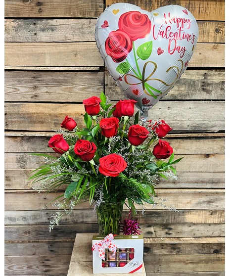 Wow them at work with 12 long stem OR 24 long stem roses arranged with filler flower such as caspia or babies breath, and assorted greenery. Perfectly bundled with exquisite assorted Pave chocolates and a festive balloon. Sure to be the talk of the office!