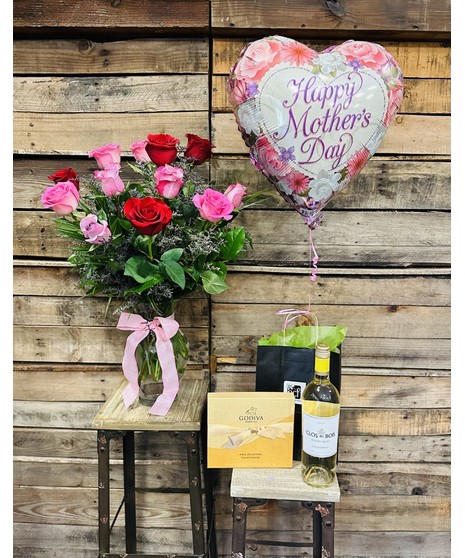 Impress the best way possible with this combination bundle! Red, pink and lavender roses are delicately arranged and delivered with a bottle of red or white, a box of chocolate and a festive holiday mylar balloon.