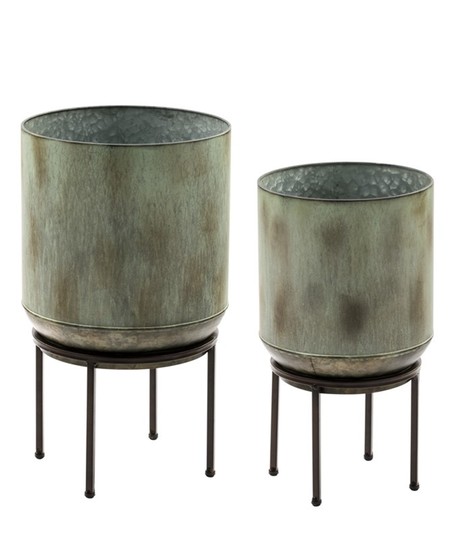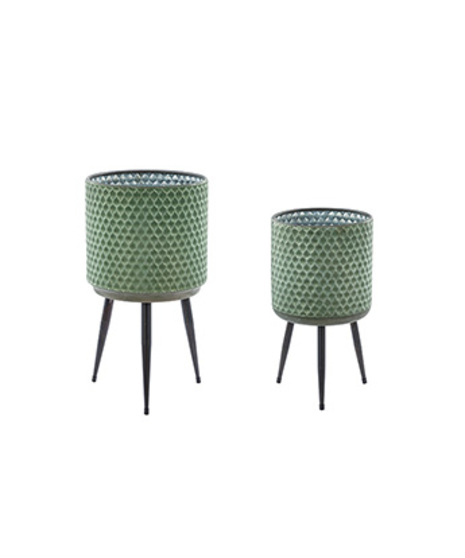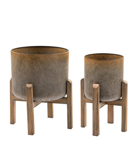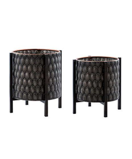 Choose from a variety of trendy plant stands from an distressed aged copper look, a soft muted green hexagon pattern or a deep brown feathered decoration. Each pot cover is featured on either wooden or metal legs. These designs are on point with today's current trends and make the perfect edition to any home or office.