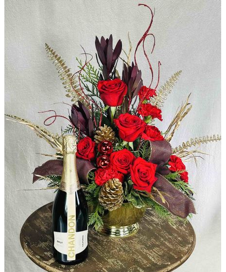 Send some pure elegance this Christmas with our Golden Elegance floral arrangement. Regal red roses and carnations are accented with burgundy safari sunset, hypericum berries, and gold and red accessories. It's pure sophistication for that special someone.