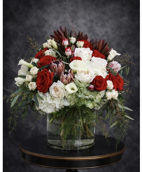 Hello... BEAUTIFUL! This arrangement is just that—filled with pink mink protea, lush red roses, crisp white callas, fragrant garden roses, and more. It is designed in a large cylinder vase with lavish greenery.