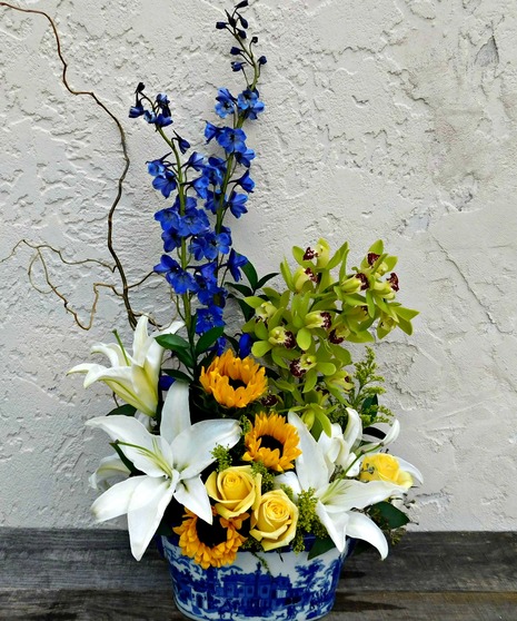 Strolling down Delphinium Lane brings back pleasant past time memories. This arrangement is arranged is a stunning vintage container filled with delphinium, lilies, orchids and sunflowers.