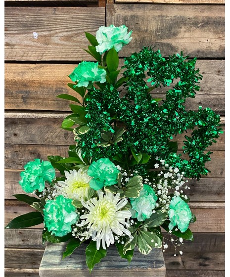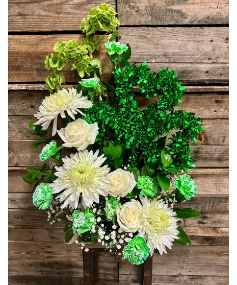 This bounty of green carnations accented with white and decorated with a shimmery SHAMROCK will make your lad or lass smile with delight and send them on a rocking holiday. Delivered fresh with lots of luck and cheer to your recipient, this is a creative, one-of-a-kind design!!