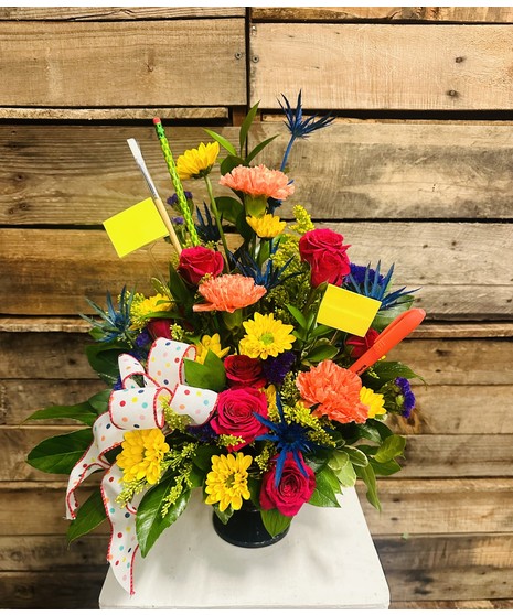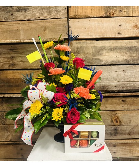 This unique arrangement stands out with its clever use of school accessories. Included in the design is a paint brush, pencil, highlighter and sticky notes. A delightful polka dot bow pulls the entire color scheme together as it makes a sharp impact in a sleek black container.